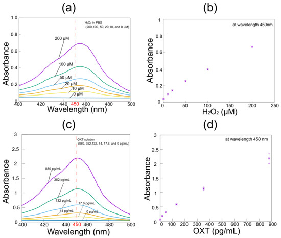 The absorption spectrum of the hydrogen peroxide solution containing TMB showed maximum absorbance at a wavelength of 450 nm (Figure 5a,b). Notably, the absorption at 450 nm depended linearly on the hydrogen peroxide level. Additionally, the coefficient of variation of absorbance was less than 0.05 at each hydrogen peroxide level, and the limit of detection was 3.0 × 10−3 pg/mL. Therefore, we concluded that TMB has a high sensitivity to hydrogen peroxide. Figure 5c,d indicate that the absorption at 450 nm was also dependent on the OXT level. Consistently, the absorbance spectra peaked at 450 nm and increased with the OXT concentration. The coefficient of variation of absorbance was less than 0.18 at each OXT concentration, and the limit of detection was 0.70 pg/mL. Although the detection limit and coefficient of variation were inferior to those of the hydrogen peroxide measurements, the ELISA method employed was highly reproducible and sensitive enough to measure low concentrations of OXT. These results confirmed that TMB is useful for image-based systems.
