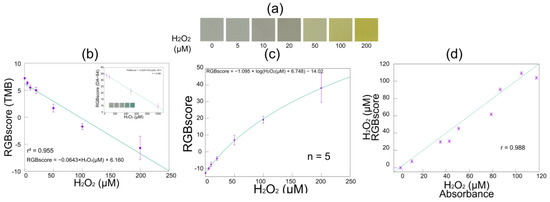 The RGBscores of TMB with different concentrations of H2O2. (a) Images of ROIs at each hydrogen peroxide concentration, (b) RGBscores obtained using linear regression, (c) a calibration curve obtained using the optimal regression model, and (d) a comparison of the RGBscores and the absorbances obtained using the conventional ELISA method.