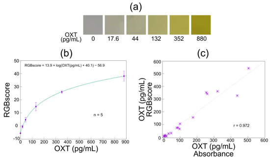RGBscores for OXT. (a) Color changes based on different concentrations of OXT, (b) calibration curve for OXT, and (c) correlation between OXT concentration estimated using conventional ELISA and OXT concentration estimated using RGBscores.