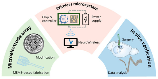 Overview of this work. The study integrates three key components. 1. Microelectrode array: fabricated using micro-electro-mechanical system technology and enhanced through surface modification. 2. Wireless microsystem: combines real-time signal processing, wireless data transmission featuring NeuroWireless, and efficient power management. 3. In vivo verification: neural signals were detected and analyzed following surgical implantation in hippocampal subregions.