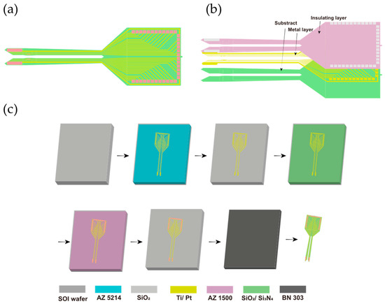 All fabrication operations were performed using the micro-electro-mechanical system (MEMS) method on a silicon-on-insulator (SOI) substrate. According to our previous work [35], and illustrated in Figure 2c, the fabrication process for the MEA involved a series of steps. A thermal oxidation process was first used to grow a SiO2 insulating layer on an SOI wafer. Metal traces were then patterned using photolithography with AZ5214, followed by sputtering of Ti/Pt and a standard lift-off process. A SiO2/Si3N4 insulation layer was deposited via plasma-enhanced chemical vapor deposition, and selective etching exposed the electrode sites and bonding pads. Finally, the MEA structures were released by deep silicon etching, followed by wet etching, during which AZ1500 and BN303 were used, completing the fabrication process. After the fabrication of MEAs, detection sites were electrodeposited with PtNPs and PEDOT:PSS to enhance biocompatibility and signal-to-noise ratio [36,37].