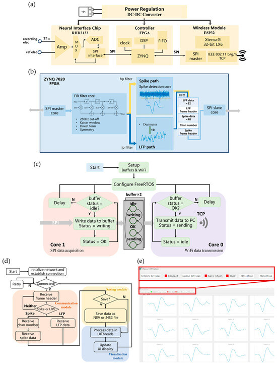Design of the wireless microsystem. (a) Hardware architecture of the wireless microsystem, showing the integration of key components. (b) Signal flow diagram for the FPGA. (c) Schematic of the ESP32’s operational mechanism, illustrating SPI data acquisition (Core 1) and TCP-based wireless transmission (Core 0) managed by FreeRTOS. (d) NeuroWireless platform schematic, featuring modules for data saving, communication, and visualization. (e) The user interface of the NeuroWireless platform, displaying real-time data visualization.