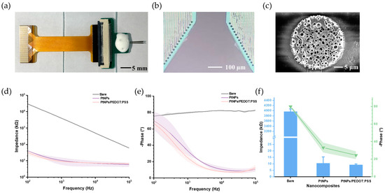 To explore the conductivity characterization of PtNPs/PEDOT:PSS, electrochemical impedance spectroscopy was conducted in phosphate-buffered saline (pH 7.4) to compare the properties of bare, PtNPs-modified, and PtNPs/PEDOT:PSS-modified microelectrodes. As shown in Figure 4d,e, the impedance of the electrodes decreased substantially with increasing frequency, while the phase delay also decreased significantly. These results indicate that both PtNPs and PtNPs/PEDOT:PSS effectively improved the impedance and phase characteristics of the MEAs, with PtNPs/PEDOT:PSS showing superior performance.