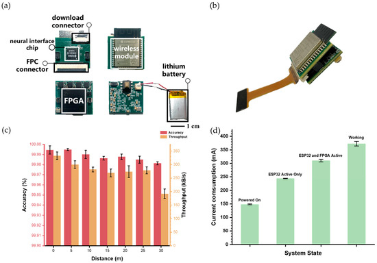 A compact, high-fidelity, and high-throughput wireless microsystem. (a) Front and back views of the wireless microsystem PCB alongside the lithium battery. (b) Fully assembled wireless microsystem connected to the flexible printed circuit. (c) Accuracy and throughput of wireless data transmission as a function of distance. (d) Current consumption of the wireless microsystem under different operational states. The data are shown as the mean ± SE.