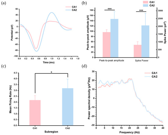 Comparison of neural activities between hippocampus CA1 and CA2. (a) Comparison of spike waveforms between the CA1 and CA2 regions. (b) Comparison of peak-to-peak amplitudes and power of spikes recorded from both subregions (*** p < 0.001). (c) Comparison of the mean firing rate of spikes in CA1 and CA2 (* p < 0.05). (d) Comparison of power spectral density of LFPs between the two subregions. The data are shown as the mean + SE.