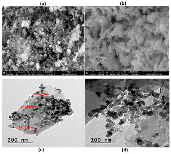 At high magnification, as depicted in Figure 2b, the nanosheets were non-uniformly distributed, slightly rough, with cracks due to the aggregation and large particle density. Furthermore, in the TEM and SEM images, the nanosheets are thin and exhibit an average size of approximately 19 nm with a typical size about 25 nm. The surface of the nanosheets is decorated with tiny nanospheres [31]. As shown in Figure 2c,d, the nanosheets are flat with a large specific surface area and large aspect ratio, meaning their length is much larger than their thickness [32,33]. Some of the nanoparticles possess hexagonal shapes, which are attributed to the presence of ZnO in the matrix. Padhan et al. [34] studied their synthesized ZnO nanoparticles using TEM that showed a hexagonal crystal structure, and then this was confirmed by the EDX spectral analysis. ZnO nanostructures developed by Moumen et al. also showed hexagonal morphology, which was confirmed by EDX analysis of their developed nanorods [35]. Thus, in the proposed study, the hexagonal-shaped morphology of some of the nanoparticles as seen in TEM images (Figure 2c,d), together with their analyzed EDX spectrum (Figure 1b), confirmed the incorporation of ZnO into the introduced nanohybrid.