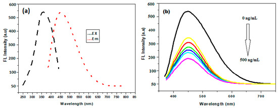 Figure 3. (a) Excitation and emission spectra of PBA@ZnO nanohybrid (at 360 and 455, respectively); and (b) Fluorescence quenching using 0.5 mL of PBA@ZnO nanohybrid at pH 3, 1.5 mL of BR buffer, and the complete response was determined after 5 min.