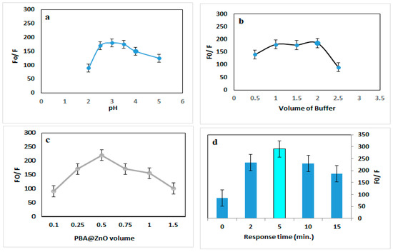 Figure 4. Effect of (a) pH, (b) buffer volume, (c) PBA@ZnO volume, and (d) response time on the quenching of PBA@ZnO fluorescence by SY (200 ng/mL).