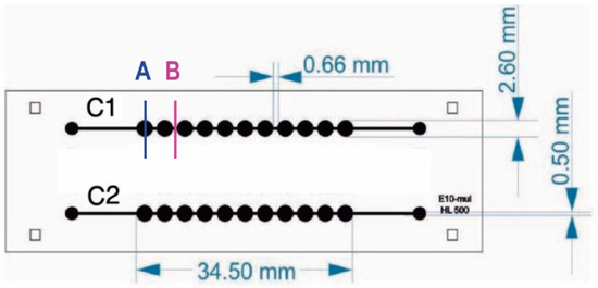 A new fabrication methodology developed by the authors enabled the generation of multilevel structures in a practical and one-step method [17,18]. Briefly, microchannel architecture was designed using Layout Editor Software 20241006 (free version Build 6 October 2024). The design of the microfluidic device is depicted in Figure 1. This design was transferred to Photopolymer Flexcel NX Thermal Imaging Layer (TIL) supplied by Eastman Kodak [19]. Sheets of 1270 × 2061 mm2 of Flexcel SRH with 1.14 mm thickness [20] were chosen. The organic compounds of the flexographic plate were crosslinked by UVA wavelengths exposure and UVC was applied to stop the reaction. An epoxy resin (Cristal-Tack, Novarchem, Villa Martelli, Argentina) was utilized to make the inverse geometry of the microchannels and form this male mold [21]; the Polydimethylsiloxane (PDMS) replicas with female geometry were obtained. PDMS pre-polymer was mixed with its curing agent SYLGARD 184 (Dow Corning, Midland, MI, USA) at a 10:1 ratio. This degassed PDMS–curing agent mixture was weighted and 3 g were poured on the male mold which was then cured at 40 °C overnight to generate a PDMS replica of 2 mm thickness.