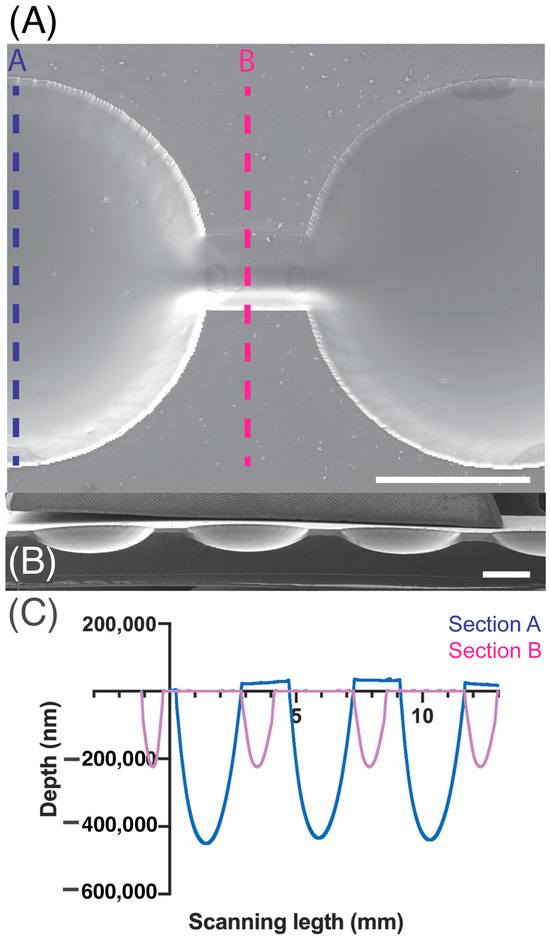 SEM magnification images of microchannel (A) top view and (B) cross-section. (C) Depth measurements acquired by profilometry of section A are indicated in blue and section B measurements are presented in pink. Scale bar: 1 mm.