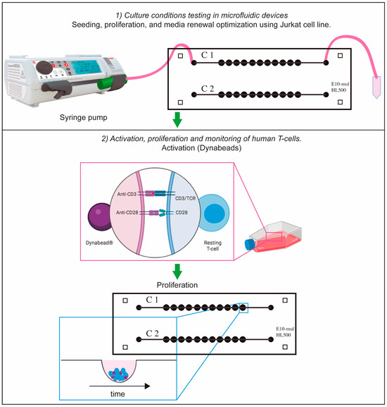 Schematic representation of cell-culturing procedure. Suspension cells (Jurkat or T-cells) were cultured in the microfluidic device by using a syringe pump. In the case of T-cells, they were activated with Dynabeads and they were cultured in T-25 flask for 2 days. After this period of time, they were transferred to the microfluidic device for proliferation tracking. Part of this figure was designed with Biorender.