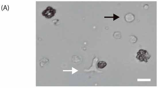 Different Jurkat cell concentrations after 5 days of culture (10×): (A) 1 × 106 cells·mL−1, cluster diameter: 210 µm; (B) 5 × 105 cells·mL−1, cluster diameter: 129 µm; (C) 2.5 × 105 cells·mL−1, cluster diameter: 49 µm.