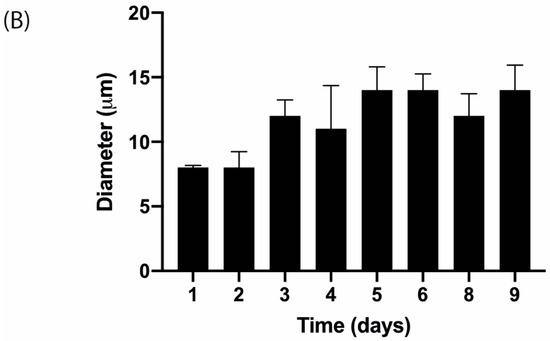 T-cell activation is recognized by morphological changes. The change in cellular shape from spherical to elongated can be seen in Figure 6A. Furthermore, the variation of cell diameter over time is depicted in Figure 6B.