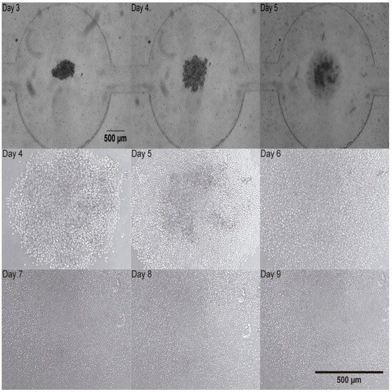 To test how healthy human T-cells would react to the miniaturized culture environment found in microfluidic devices, activated human T-cells and magnetic beads were monitored in the microfluidic device for 9 days. After activation with anti CD3/CD28 magnetic beads in T-25 cell culture flasks (Figure 3), activated human T-cells were found to form clusters at the bottom of each microchamber as can be seen in Figure 7. Once cells reach the bottom of the well, they are shielded from shear stress [14]. Medium renewal was performed every 3 days without detrimentally affecting T-cell expansion. Figure 7 shows representative images, depicting cell proliferation.