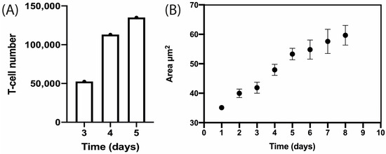 T-cell cluster development was microscopically tracked from Day 3 to Day 9 and two parameters were estimated by image analysis. First, T-cell number was calculated by approximating the cluster to a semi-ellipse. Then, it was observed that T-cell number increased from Day 3 to 5 as it is presented in Figure 8A. Second, the area occupied by the cluster was measured and found to increase from Day 4 to Day 7. In the next days, the increase in area could not be measured as the field of view was entirely covered by cells.