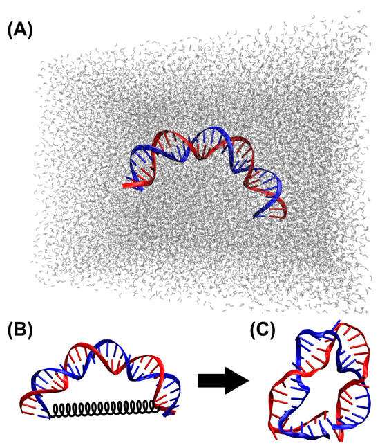 The 30 bp sequence of the bent DNA bows from our previous work [59,60] was used in the MD simulations in this study. Briefly, strand B has a sequence of 5′ - CTG CTG AAT TCT GTG GAG TCG TCG TAT GTC - 3′, while the sequence of the complementary strand (strand C) is 3′ - GAC GAC TTA AGA CAC CTC AGC AGC ATA CAG - 5′. The initial conformation of the double-stranded DNA was generated by X3DNA [69,70,71], with the global bending angle set to 160° (Figure 1A). The produced DNA sequence from X3DNA was further cleaned in VMD (version 1.9.3), followed by generating the PSF and PDB files for MD simulations using psfgen [72].