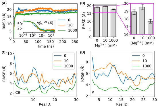 RMSD and RMSF of the MD simulations. (A) RMSD of the simulations with Mg2+ ions at different concentrations, from 0 mM (control) to 1000 mM. Inset: distance between the C6 atoms of residue 2 and 29 (where the virtual spring is attached), , as a function of time. (B) Average RMSD of the last 100 ns of the simulations at different concentrations of Mg2+ ions. The region highlighted by the magenta box is zoomed in to show the difference. (C,D) RMSF of the residues/bases (Res.ID) for the (C) C6 atoms and (D) P atoms, respectively, at different Mg2+ concentrations (in mM) from the full trajectories of simulations.