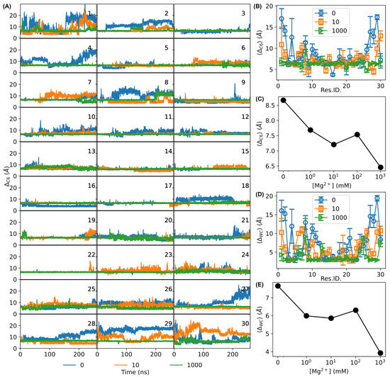 We first analyzed the structural dynamics of the bent DNA amplifying sensors using root mean square deviation (RMSD) and root mean square fluctuation (RMSF). As shown in Figure 3A, the RMSD curves of the DNA molecule with Mg2+ ions increased quickly in ns and then became stable, indicating that the simulations converged. The first ns corresponded to the shrinkage process of the virtual spring attached to residues 2 and 29, as the distance between the C6 atoms of these two residues decreased to stable values in ns (inset of Figure 3). We observed that the RMSD values of the DNA sensors remained consistently lower with 1000 mM Mg2+ ions than those with 0 or 10 mM Mg2+ ions (Figure 3A). Comparing the average RMSD values from the last 100 ns of the simulations showed that this difference was outside of the error bar (Figure 3B). Additionally, we observed slightly larger transitions in the RMSD trajectories at lower concentrations of Mg2+ ions (Figure 3A). Similar to the RMSD values, the RMSF values of C6 atoms and P atoms were consistently lower in the presence of Mg2+ ions at 1000 mM than the control (Figure 3C,D). The decrease in RMSF values in the presence of Mg2+ ions was consistent with a previous study on straight double-stranded DNA [75] and the well-known stabilization effects of Mg2+ ions on DNA molecules [26,28,67,68].