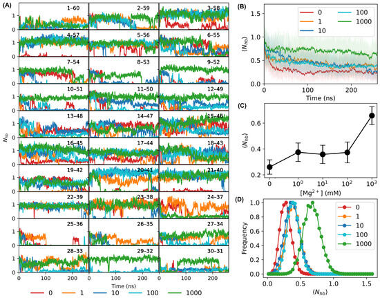 The stabilizing effects of Mg2+ ions can also be seen from the number of hydrogen bonds formed in the sharply bent DNA sensors. The hydrogen bonds were identified by VMD with a cutoff distance of 3 Å and a cutoff angle of 20°, and the number of hydrogen bonds for each base-pair was counted. As shown in Figure 6A, although the number of hydrogen bonds, , showed large variations during the simulations and for different base-pairs, was generally lower without Mg2+ ions (red curves) than those with Mg2+ ions (e.g., green and cyan curves). The most obvious difference could be seen at residues/bases #3, #4, #8–#12, #16, #17, #20, #21, and #27–#30 (Figure 6A). Taking base-pairs 4–57 and 21–40 as examples, almost no hydrogen bonds were formed in the bent DNA molecule without Mg2+ ions, while the number of hydrogen bonds was stable with Mg2+ ions. On the other hand, we note that some base-pairs showed low numbers of hydrogen bonds and large fluctuations even with 1000 mM Mg2+ ions (e.g., #13 and #24–#26). Therefore, to obtain a better view of the effects of Mg2+ ions on the number of hydrogen bonds in the bent DNA molecules, we calculated the average number of hydrogen bonds per base-pair and examined the distributions of the average number of hydrogen bonds per base-pair under different conditions. As shown in Figure 6B, the average number of hydrogen bonds decreased in the first ns of the simulations. After 100 ns, the average number of hydrogen bonds in the bent DNA molecule became stable for all the simulations. However, the average number of hydrogen bonds per base-pair was much higher in the presence of 1000 mM Mg2+ ions than that of the control (0 mM Mg2+ ions). Calculating the average number of hydrogen bonds per base-pair for all the residues/bases of the DNA molecule from the last 100 ns of the simulations showed that it increased as the concentration of Mg2+ ions increased (Figure 6C). Additionally, we plotted the distributions of at different concentrations of Mg2+ ions from the last 100 ns of the simulations (Figure 6C). The distributions appeared as bell-shaped peaks, and the peak shifted to higher values as the concentration of Mg2+ ions increased (Figure 6D).