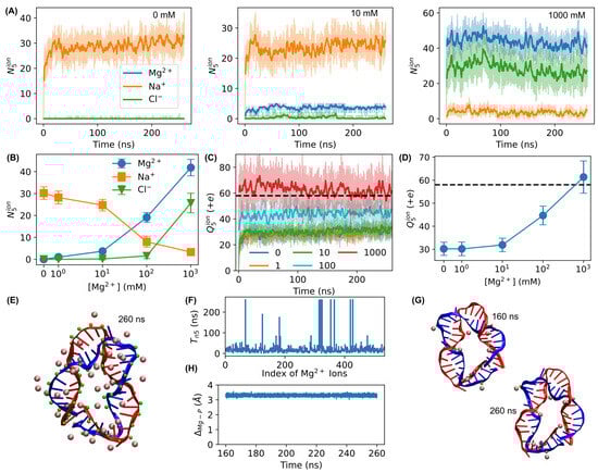 As charge neutralization by Mg2+ ions plays an essential role in stabilizing the base-pairing and stacking of DNA [80,81,82], we examined the number of ions at a proximity of 5 Å of the bent DNA amplifying sensors. We observed that, without or at low concentrations of Mg2+ ions, the Na+ ions increased quickly and remained at a proximity of the DNA as counterions (Figure 8A). However, with 1000 mM Mg2+ ions, the Na+ ions were replaced by the Mg2+ ions (Figure 8A). Quantifying the average number of ions from the last 100 ns of the simulations showed that the number of Mg2+ ions at a proximity of 5 Å of the DNA molecules increased as the bulk concentration of Mg2+ ions increased, while Na+ ions showed the opposite (Figure 8B). Although the number of Cl− ions in proximity to 5 Å of the DNA also increased at high Mg2+ concentrations (Figure 8A,B), we found that the total charge at the proximity of 5 Å of the DNA, , increased at higher concentrations of bulk Mg2+ ions (Figure 8C,D). With 1000 mM Mg2+ ions, the total charge from the ions at a proximity of the DNA balanced the negative charge of the DNA molecule (Figure 8C,D). Visualizing all the nearby Mg2+ ions and phosphorus atoms of the DNA indicated that some Mg2+ ions appeared close to the phosphorus atoms (Figure 8E), supporting that Mg2+ ions function as the counterions of negative phosphate groups of DNA. A closer look at each Mg2+ ion showed that some Mg2+ ions stayed at a proximity of the DNA molecule for long durations (∼100 ns or even >200 ns, as shown in Figure 8F). Examining those Mg2+ ions remaining in a proximity of the DNA showed that some of them formed lasting Mg–P pairs (Figure 8G). Quantifying the distance of a Mg–P pair from the last 100 ns of the simulation showed that it remained constant at Å (Figure 8H). These results confirmed that charge neutralization by Mg2+ ions plays an important role in the stabilization of bent DNA amplifying sensors.