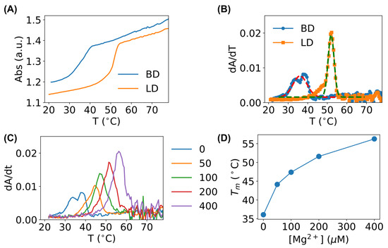 Melting curve comparison between sharply bent DNA sensors (BD) and linear DNA (LD). (A) Absorption (wavelength = 260 nm) of the sharply bent DNA sensors (BD) and the corresponding linear DNA (LD) at the same concentration as the temperature increases. (B) Derivative of the absorption curves () to determine the melting temperatures (). Dashed lines are fit with a Gaussian function. (C) Melting curves () of the bent DNA sensors in the presence of Mg2+ ions at different concentrations (in μM). (D) Dependence of the melting temperature of the bent DNA sensors on the concentration of Mg2+ ions.