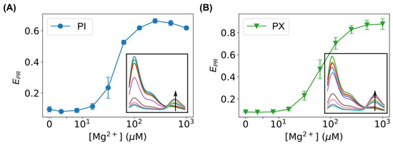 To further verify the predictions from the MD simulations, we performed ensemble FRET measurements on fluorescently labeled bent DNA amplifying sensors using a fluorospectrometer. Two labeling constructs were used. The first construct was labeled at the end of the bent DNA strand (i.e., Cy5 at residue #1 of strand B and Cy3 at its complementary base on strand CS). The fluorescence spectra are shown in the inset of Figure 10A for the bent DNA with Mg2+ ions at different concentrations (from 0 to 1000 μM). The concentration range of Mg2+ ions was chosen to ensure the majority of bent DNA sensors remained as individual bows (i.e., monomers) [59,60] so that we could assess the relative changes in the base-pair distances in the bent DNA structures. As the calculation of the true FRET efficiency requires various corrections (e.g., quantum yields, detector sensitivity, and spectral leakage), it is a common practice to use the proximity ratio to approximate the FRET efficiency [83], , where is the fluorescence intensity of the acceptor (Cy5) at a wavelength of 670 nm, and is the fluorescence intensity of the donor (Cy3) at a wavelength of 570 nm. Due to its simplicity, the FRET proximity ratio was estimated in this study to assess relative changes. As shown in Figure 10A, the FRET proximity ratio () increased as the concentration of Mg2+ ions increased, confirming that Mg2+ reduced the distance between the donor and acceptor and, thus, the base-pair distance of the bent DNA molecule. For the second construct, we labeled residue #10 of strand B and its complementary base on strand CS. We observed a similar dependence of the FRET proximity ratio on the Mg2+ concentration (Figure 10B).