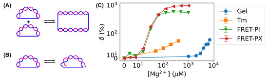 In contrast, both the melting curve-based method and the FRET-based method measure the disruption of DNA base-pairing (Figure 5 and Figure 6). Therefore, these methods detect subtler changes in the hybridization of bent DNA amplifying sensors (Figure 11B) compared to gel electrophoresis and, thus, further improve the sensitivity of bent DNA amplifying sensors. This improvement can be seen from the concentration range of Mg2+ ions in the current work ( mM) and that in our previous work ( mM) [59,60]. In both studies, the DNA sequences were kept the same. For a more direct comparison, we quantified the relative changes in the measured quantities with Mg2+ ions at different concentrations (c) compared to the control without Mg2+ ions [], . The measured quantities Q are the FRET proximity ratios (), melting temperature (), and band intensities of bent DNA bands (I) in three types of measurements, respectively. As shown in Figure 11C, the relative changes increased as the concentration of Mg2+ ions increased for all three measurement methods. However, the relative changes rose at much lower concentrations of Mg2+ ions for the FRET and melting-based methods (Figure 11C). FRET-based measurements were orders of magnitude ( times) more sensitive than gel electrophoresis (Figure 11C).