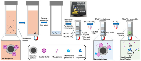 Detection of virus in wastewater using a handheld instrument, a cassette with integrated TRAPs, and hydrogel-coated magnetic particles (Nanotrap particles). The Nanotrap particles are added to 3 mL wastewater samples and briefly incubated. Following magnetic isolation, the particles are transferred to a custom cassette containing TRAPs, and the cassette is loaded into a handheld instrument. The cassette is warmed to melt the first TRAP, which liquifies but remains in place. A magnet beneath the cassette pulls the beads into a lysis reagent. After incubation, the cassette is further heated to melt the second TRAP, which breaches, causing the RT-LAMP reagents to be added to the lysate. During RT-LAMP, the instrument records the fluorescence in real time.