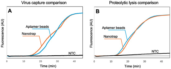 In our previous work with SARS-CoV-2 [43,44], we utilized aptamer-functionalized magnetic beads to capture the virus in biological samples. However, aptamers are vulnerable to nucleases in sample matrices, they require special storage conditions, and they are specific to one virus. In contrast, the chemistry of the Nanotrap hydrogel-coated magnetic particles is not affected by nucleases, they can be stored at room temperature, and they are not specific to a single virus, suggesting the possibility of multiplexing. To assess the capability of the Nanotrap particles to capture SARS-CoV-2 virus in wastewater samples, we added Nanotrap particles or aptamer-functionalized microbeads to spiked wastewater samples with SARS-CoV-2, then recovered the beads and used a standard RNA extraction kit followed by RT-LAMP in a benchtop qPCR to quantify the amount of virus captured. Figure 3A shows the real-time amplification curves recorded by the thermal cycler. Amplification is evident within about 15 min, demonstrating that the Nanotrap particles can capture SARS-CoV-2 from wastewater and release the RNA following lysis.
