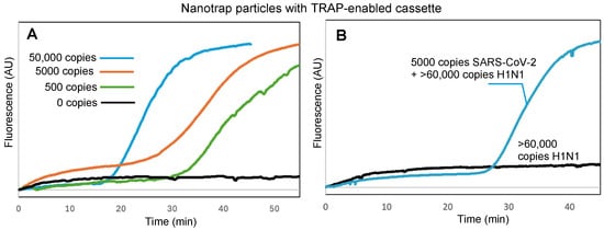 We further confirmed that Nanotrap particles and TRAP-enabled cassettes maintain their performance in samples with competing background components. First, we spiked SARS-CoV-2 into a sample of 1 mg/mL BSA, which could compete for the surface area on the hydrogel-coated magnetic particles. Despite the high background protein concentration, amplification and detection was successful (Figure S4, Supplementary Materials). Similarly, amplification and detection was successful when virus was spiked into a sample containing 106 CFU of E. coli (Figure S5, Supplementary Materials). To demonstrate specific detection of SARS-CoV-2, we spiked samples with H1N1 or both SARS-CoV-2 and H1N1. Figure 4B shows that amplification did not occur with H1N1 only, but did occur when SARS-CoV-2 was present. Times to positive for all three challenges were similar to those in Figure 4A for the same number of copies of SARS-CoV-2, indicating that minimal or no inhibition occurred.