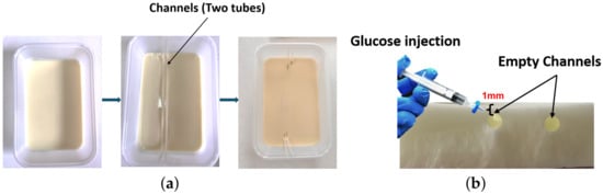 (a) Preparation of the skin phantom with embedded capillary-like channels and (b) capillary-like channels for glucose injection formed after tube removal.