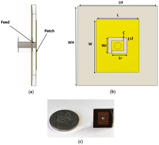 (a) Side view of the single-port patch antenna, (b) top view of the antenna geometry, and (c) fabricated miniature patch antenna.