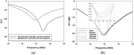 (a) Simulation and measurement of S11 parameters for the proposed microwave sensor and (b) simulated for various dielectric properties of the inserted vein.