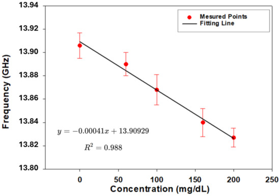 Figure 11 illustrates the linear relationship between glucose concentration and resonance frequency, demonstrating the sensor’s ability to detect glucose variations with high precision. The red points represent experimentally measured resonance frequencies, while the black line corresponds to the fitted linear regression, provided by the equation