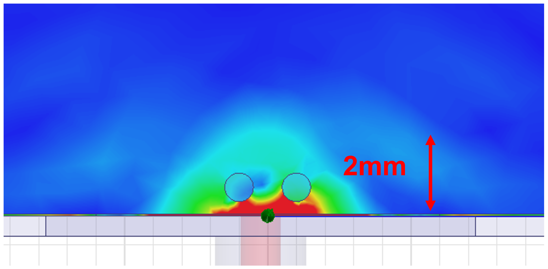 Simulated electromagnetic field distribution, showing a penetration depth of 1.5 mm into the skin phantom.
