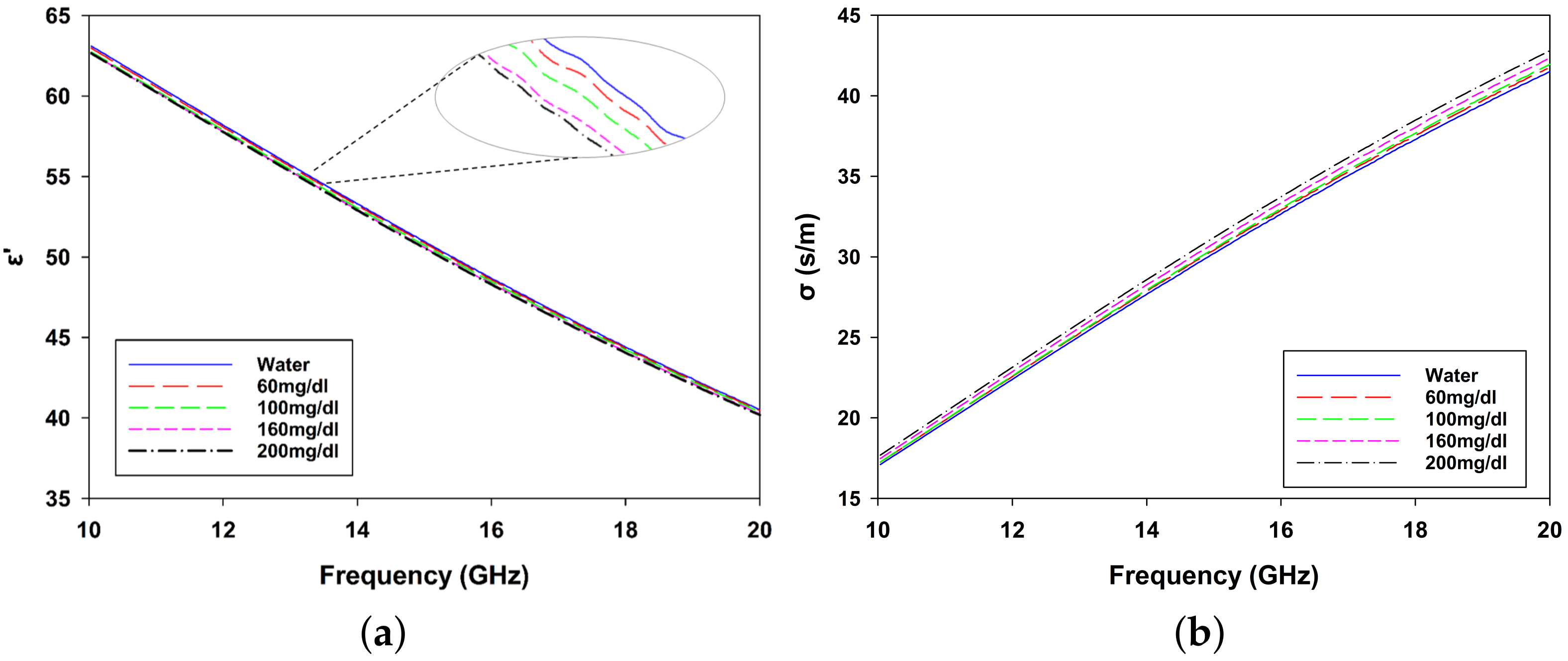 (a) Relative dielectric constant () and (b) conductivity () of glucose solutions for concentrations of 60 mg/dL, 100 mg/dL, 160 mg/dL, 200 mg/dL, and water.