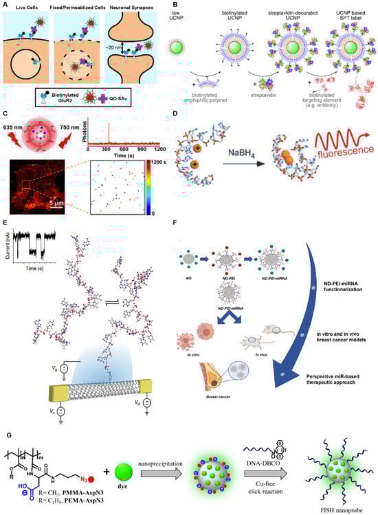 Nanoparticles utilized as single-molecule fluorescent probes. (A) Schematic representation of various molecular labeling approaches evaluated using quantum dots of diverse sizes as fluorescent probes. Reprinted with permission from ref. [29]. Copyright © 2020 American Chemical Society. (B) A biotin–streptavidin–biotin approach is depicted for the assembly of upconverting fluorescent nanoparticle (UCNP)-based single-particle tracking (SPT) labels. Reprinted with permission from ref. [24]. Copyright © 2024 American Chemical Society. (C) Near-infrared blinking carbon dots (CDs) specifically engineered for applications in single-molecule localization microscopy (SMLM). Reprinted with permission from ref. [30]. Copyright © 2022 American Chemical Society. (D) Schematic of the IR-Emitting C12-Agn formation, which involves the complexation of C12DNA with silver cations, followed by reduction in the mixture with sodium borohydride (NaBH4). Reprinted from ref. [31]. Copyright © 2007 by The National Academy of Sciences of the USA. (E) Scaled schematic of a SWCNT-based single-molecule field-effect transistor (smFET) device structure. Reprinted from ref. [32]. (F) The functional nucleic acid delivery (FND) system designed for the delivery of microRNA-34a (miR-34a). Reprinted from ref. [33]. (G) Nanoprobes based on plasmonic nanoparticles (PNPs). Reprinted with permission from ref. [34]. Copyright © 2021 American Chemical Society.