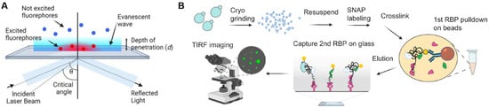 Total internal reflection fluorescence. (A) Principle of TIRF. Reprinted from ref. [54]. (B) Schematic diagram of mRNP-SiMPull procedure for isolating mRNPs from yeast cells and single-molecule imaging of RBP components. Reprinted from ref. [60].