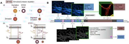Stimulated emission depletion. (A) Schematic diagram of STED nanoscopy. Reprinted from ref. [65]. (B) Schematic diagram of event-triggered STED. Reprinted from ref. [69].