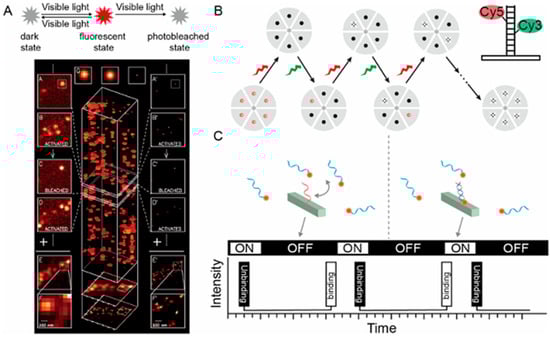 Principles of three single-molecule localization microscopy. (A) Principle of PALM. The PA-FP (photoactivatable fluorescent protein) molecules attach to proteins of interest. (B) Principle of STORM. Improved clarity by separating the roles of the green and red lasers and refining the description of the imaging process. (C) Principles of DNA-PAINT. Reprinted with permission from ref. [76].