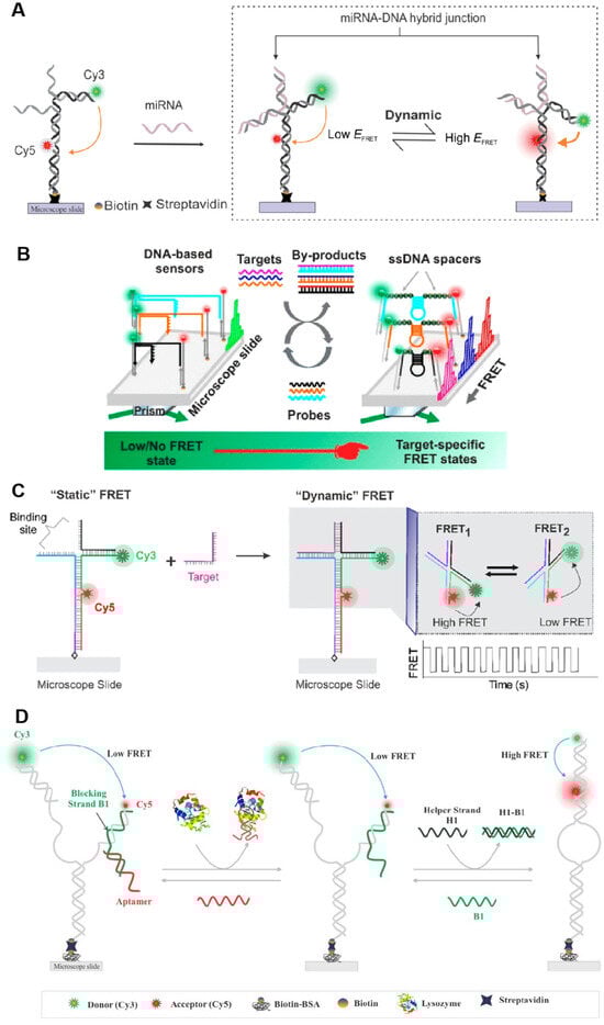 - Kaur, A.; Sapkota, K.; Dhakal, S. Multiplexed Nucleic Acid Sensing with Single-Molecule FRET. ACS Sens. 2019, 4, 623–633. [Google Scholar] [CrossRef] [PubMed]