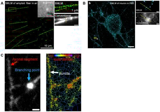 SMLM bioimages based on burst-blinking nanographenes. (A) SMLM of amyloid fiber in air. (B) SMLM of neuron in PBS. (b) Reconstructed SMLM image of global nascent proteins in neurons. Imaging was performed in PBS solution. (c) Magnification of SMLM image and conventional wide-field fluorescence image for the yellow box region in (b), respectively. (C) Conventional wide-field fluorescence image of networks in neurons (left) and corresponding Voronoi diagram image (right) of the same position. Reprinted from ref. [133].