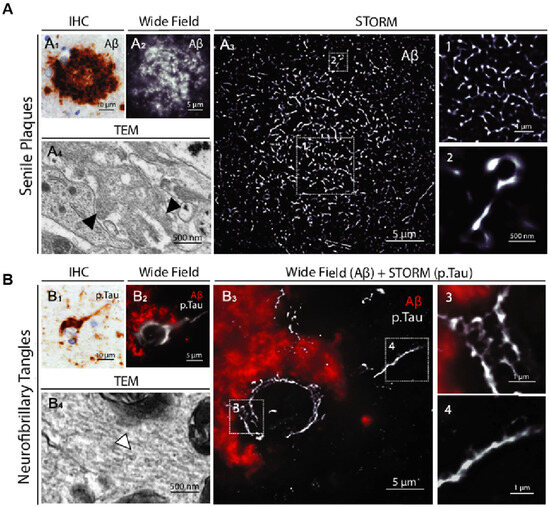STORM images of senile plaques and neurofibrillary tangles in AD patient brains. (A) Shown from left to right are immunohistochemical staining, conventional fluorescence microscopy imaging, and super-resolution STORM images of a senile plaque located in the neocortex of an Alzheimer’s disease (AD) patient. (A1) Representative image of a senile plaque in the neocortex of an AD patient (immunohistochemical detection of Ab). (A2) Conventional fluorescence microscopy image of a whole senile plaque in a neocortex section of the same patient immunostained for Ab. (A3) STORM image of the same area. The insets (1 and 2) show close-up details of the distribution and size of aggregated Ab branches. (A4) Comparative TEM image of Ab fibrils (black arrowheads) in a senile plaque. (B) Displayed from left to right are representative images of neurofibrillary tangles in the neocortex of AD patients, captured using immunohistochemical staining, conventional fluorescence microscopy, and a combined approach that integrates conventional fluorescence microscopy for β-amyloid (Aβ) detection with STORM imaging for phosphorylated tau (p.Tau) visualization. Reprinted from ref. (B1) Representative image of neurofibrillary tangles in the neocortex of an AD patient (immunohistochemical detection of p.Tau). (B2) Conventional fluorescence microscopy image of neurofibrillary tangles within the soma of a whole degenerating neuron surrounded by Ab deposition in a neocortex section of the same patient. (B3) Same neuron imaged by combining conventional fluorescence microscopy (Ab) and STORM (p.Tau). The insets (3 and 4) show close-up details of the honeycombed structure of p.Tau aggregates in the soma and the filamentous organization in the axon. (B4) Comparative TEM image of Tau filaments (white arrowhead) in neurofibrillary tangles [145].
