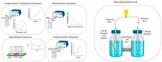 A block diagram of the biosensor’s design and operation. (a) Schematic representation of a microbial fuel cell biosensor in 3D; (b) biosensor operation interface. Reprinted from ref. [104] © 2018 by the authors.