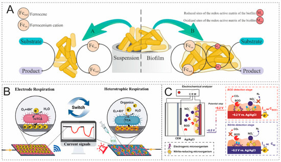 (A) The mechanism of electron transfer in the “ferrocene–immobilized microorganisms” system and in the “ferrocene–microbial biofilm” system. Reprinted from ref. [67] Copyright © 2024 Creative Commons Attribution 4.0 License. (B) Switching between electrotrophic and heterotrophic respiration makes it possible to sensitively detect BOD, demonstrating the possibility of using bacteria switching between two competing metabolic pathways as biosensors. Reprinted with permission from ref. [64] © 2023 Elsevier B.V. All rights reserved. (C) A new two-functional electrochemical biosensor capable of performing the rapid and simultaneous detection of nitrites and dissolved BOD. Reprinted with permission from ref. [70] © 2023 Elsevier B.V. All rights reserved.
