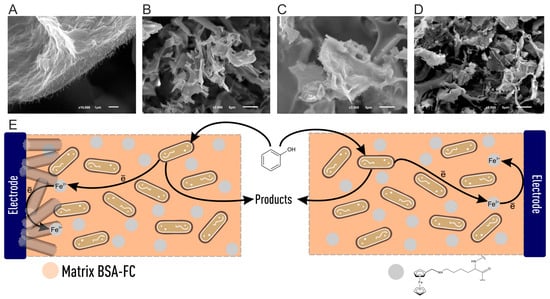 (A–D) SEM photographs of the BSA-FC/CNT matrix at various stages of modification; (E) the electronic transfer mechanism in the matrix. Reprinted from ref. [155] © 2022 by the authors.