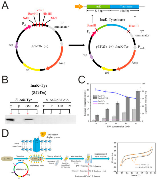 - Zhao, S.; Zhou, T.; Khan, A.; Chen, Z.; Liu, P.; Li, X. A Novel Electrochemical Biosensor for Bisphenol A Detection Based on Engineered Escherichia coli Cells with a Surface-Display of Tyrosinase. Sens. Actuators B Chem. 2022, 353, 131063. [Google Scholar] [CrossRef]