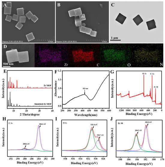 (A) SEM image of Zr MOF. (B) SEM image, (C) TEM image, (D) and element mapping images of Zr MOF-PEI. (E) XRD pattern and (F) UV–vis spectrum of Zr MOF. (G) XPS survey spectrum and high-resolution spectra of (H) O 1s, (I) C 1s, and (J) Zr 3d for Zr MOF. In (E), the red line represents Zr MOF and the black line represents Simulated Zr MOF.