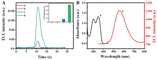(A) ECL signals of (a) bare GCE, (b) Zr MOF, (c) mixture of Zr MOF and PEI, and (d) Zr MOF-PEI in PBS. (B) ECL spectrum of Zr MOF-PEI (a) and UV–visible absorption spectrum of Luminol (b).