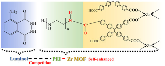 In this work, a Zr MOF was chosen as one of the luminophores. To enhance the ECL performance of the Zr MOF, a co-reactant (polyethyleneimine, PEI) was covalently bonded to the Zr MOF to form a Zr MOF-PEI composite, which produced an intramolecular self-enhancement effect. Luminol, as one of the most classic luminophores [33,34,35], has the advantages of low cost, good water solubility, and low excitation potential. It has a high and stable ECL emission efficiency with the presence of PEI; thus, it was selected as an additional luminophore. Based on the competition between Luminol and the Zr MOF for PEI, an appropriate amount of PEI was covalently linked to the Zr MOF and the synergistic effect of self-enhancing strategy and competition mechanism was discussed, so as to conduct accurate quantitative analysis of the target. This is crucial for the successful construction of competitive dual-signal ECL sensors.